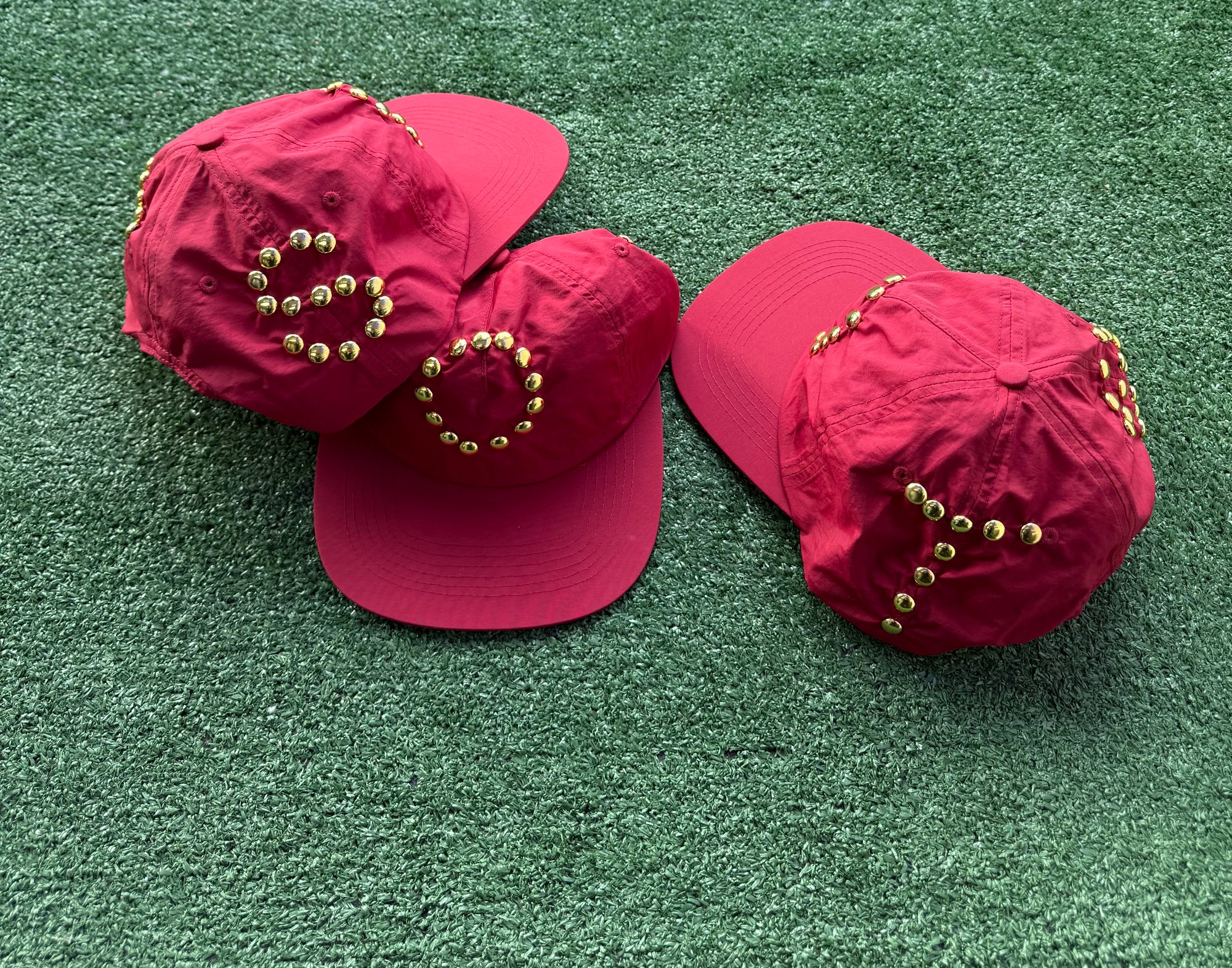 Nylon hat Gold metal studs on all panels Adjustable Single Strap One Size Fits Most Please Allow 7 - 14 Business Days After Purchase to be shipped(Weekends NOT Included)
